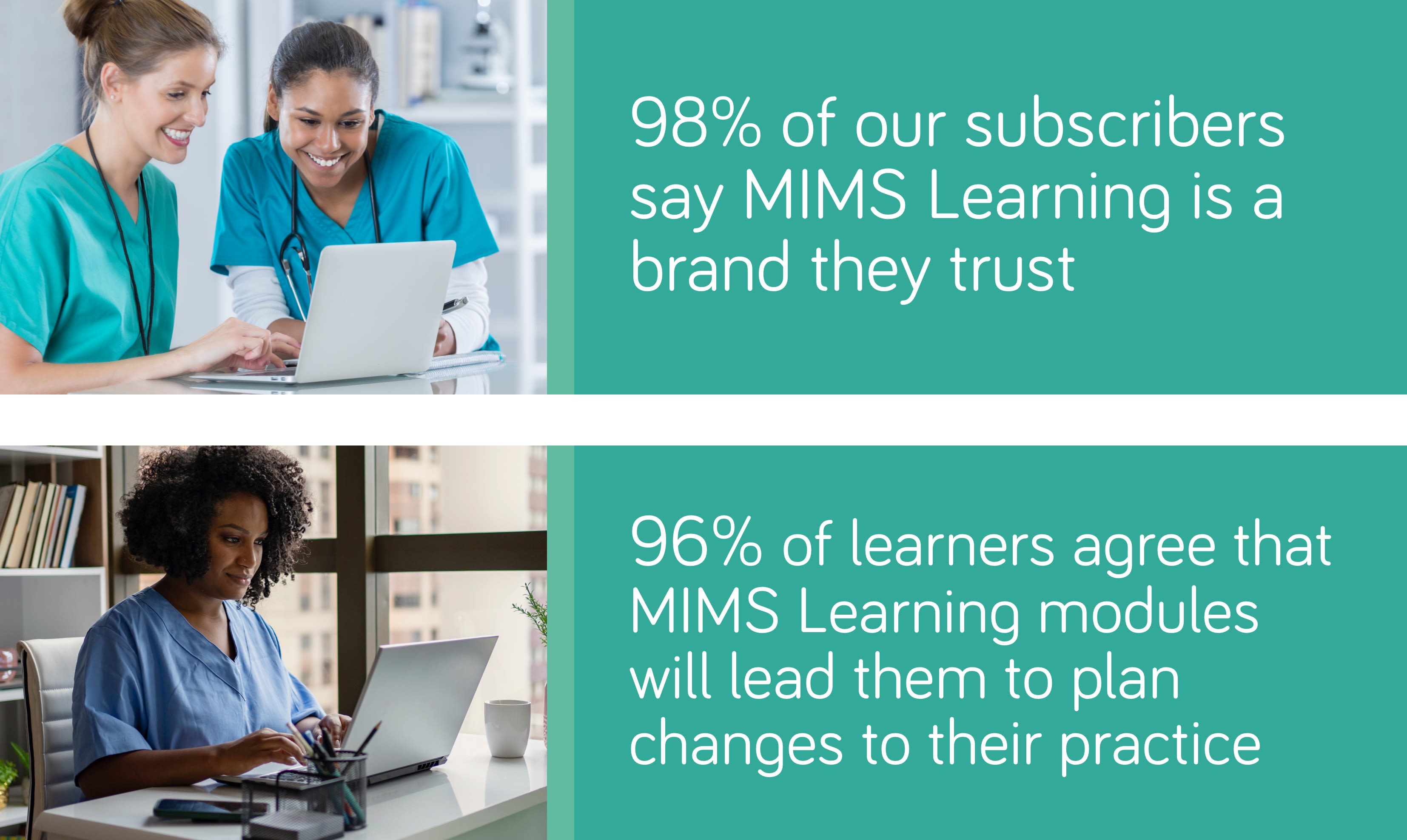 MIMS Learning supports best clinical practice and enables GPs, hospital doctors, nurses and other healthcare professionals in the UK to meet their CPD requirements for appraisal and revalidation. Our e-learning covers 11 key specialities: primary care, cardiology, dermatology, diabetes, women’s health, gastroenterology, mental health, oncology, paediatrics, respiratory and care of older people. Our CPD learning is second to none, offering over 500 practice-changing modules in a variety of formats (including live webinars and podcasts) to appeal to our learners’ needs.